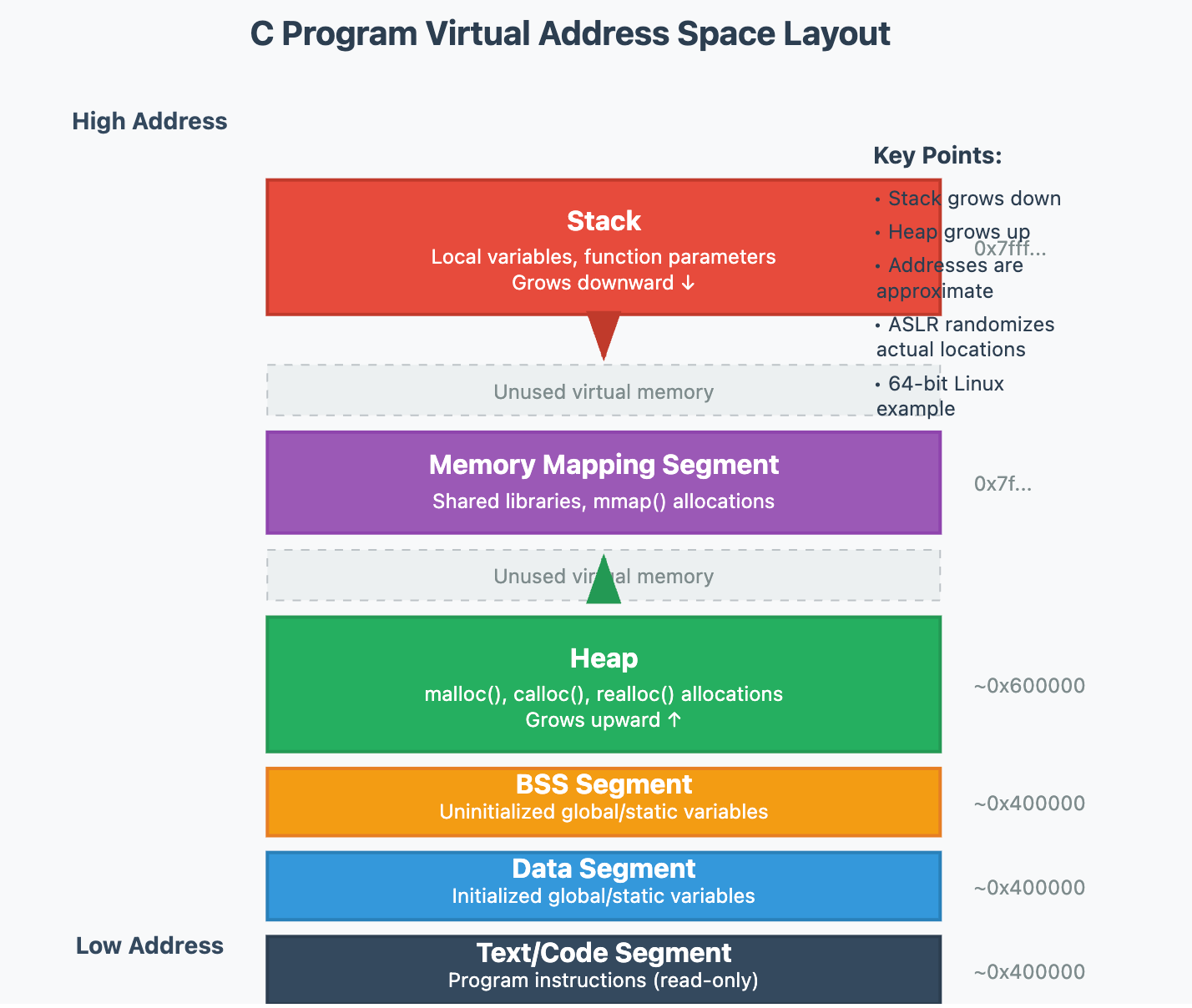 In a C program, the heap is located in a specific region of the process's virtual memory space. Here's where it sits in the typical memory layout: