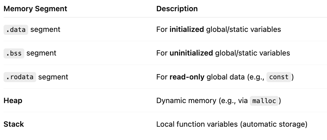 At runtime, this memory is directly accessed by functions via absolute addresses. No copying or passing is required — they are directly referenced in the generated machine code.